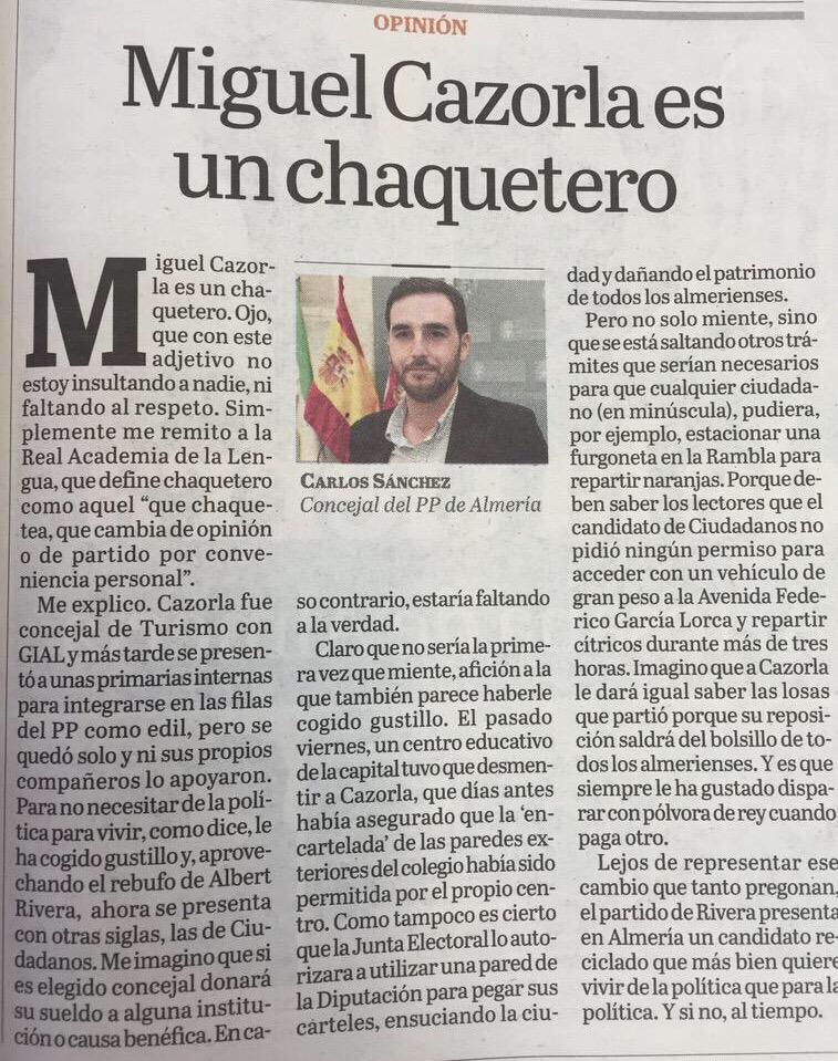 No obstante, lo que nadie se explica es cómo los miembros de C´s Almería, incluidos los cargos electos, no se han plantado en serio ante la dirección de su partido al verse públicamente desautorizados y, en cierta medida, burlados, engañados y ninguneados ante sus paisanos. El discurso regenerador de C´s en Almería, independientemente de a quien han apoyado finalmente, ha saltado por los aires hecho añicos con un simple correo electrónico enviado con nocturnidad desde Madrid.